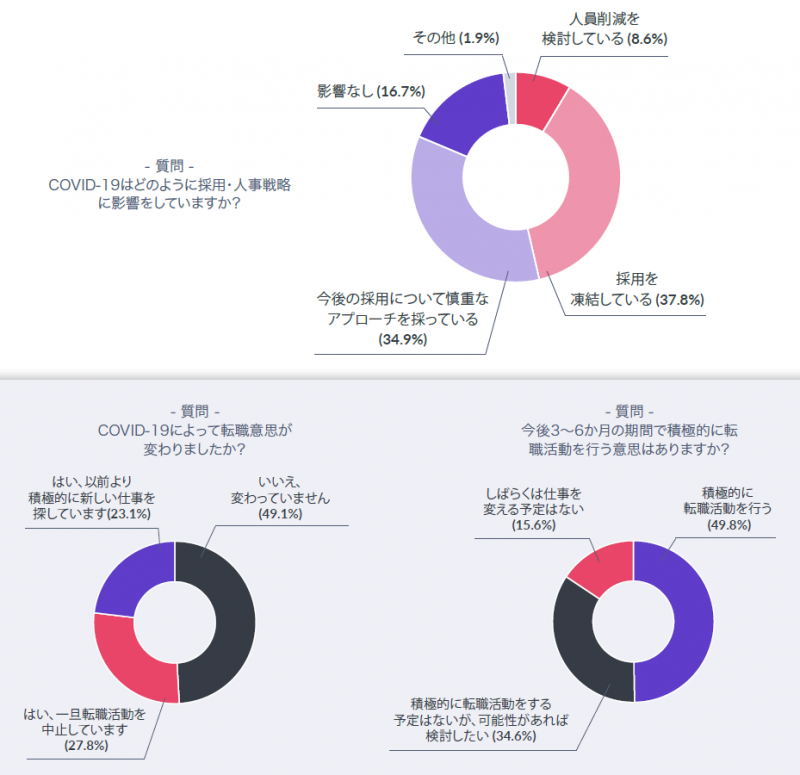 - 38%の企業が採用凍結と回答したものの半数は継続、従業員の2割は新型コロナ以降に転職意欲高まる